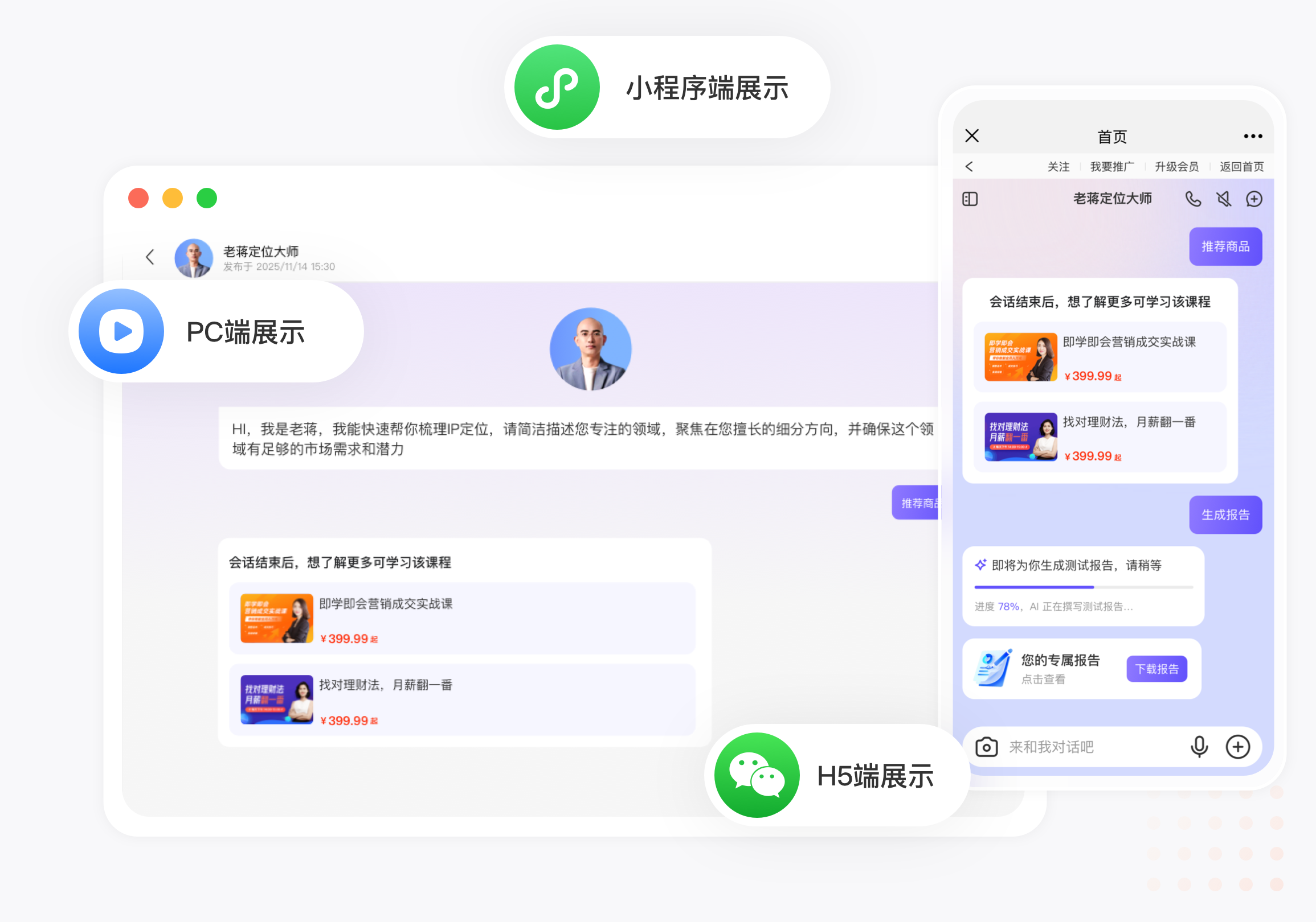 小程序 + H5+PC 全覆盖,轻量化入口降低用户使用成本,让每一位学员在微信里就能使用专属AI智能体