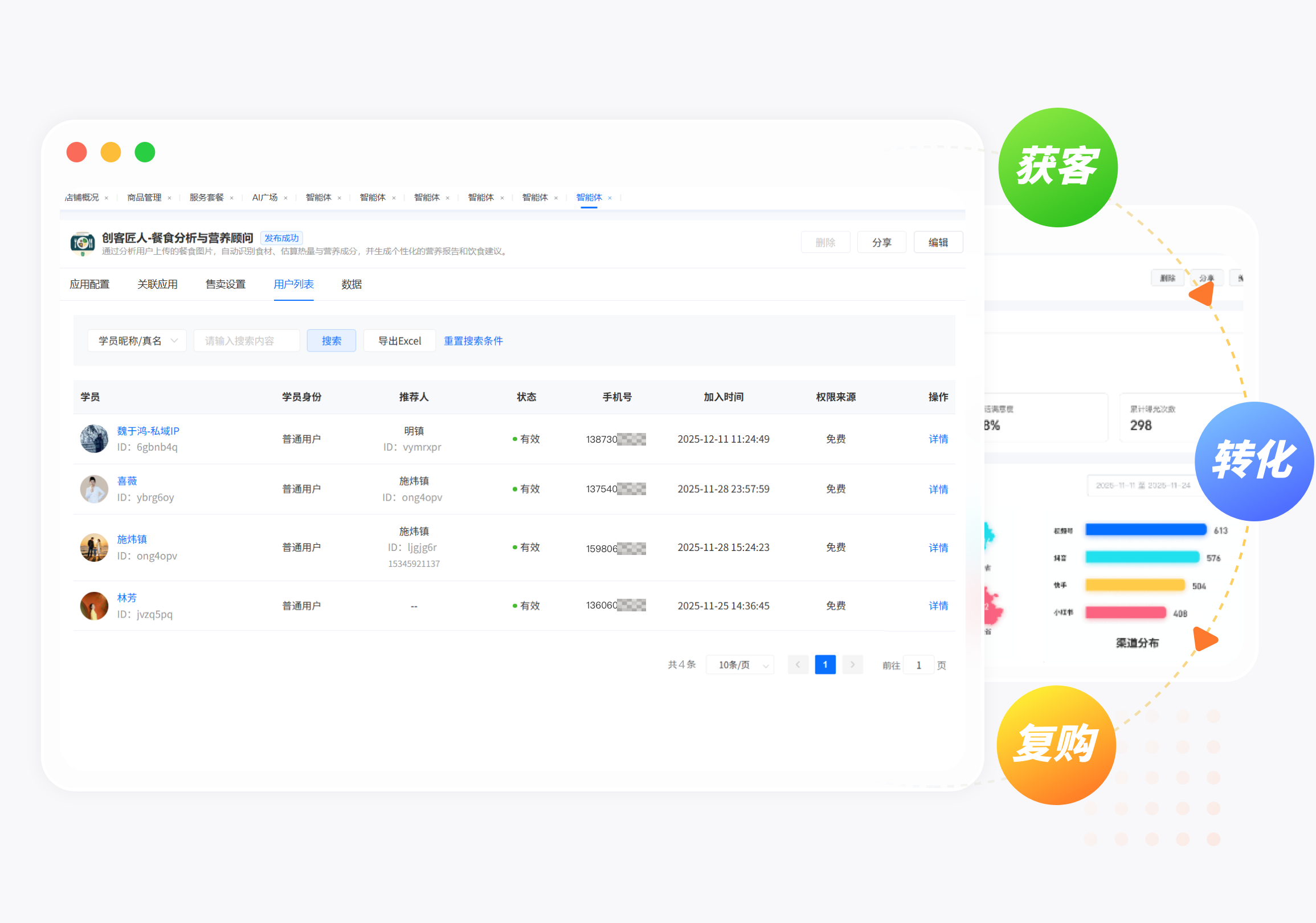从用户电话到行为意向,数据自动沉淀至后台,获客、转化、复购一站式搞定,让每一次AI互动,都成为可运营的用户资产