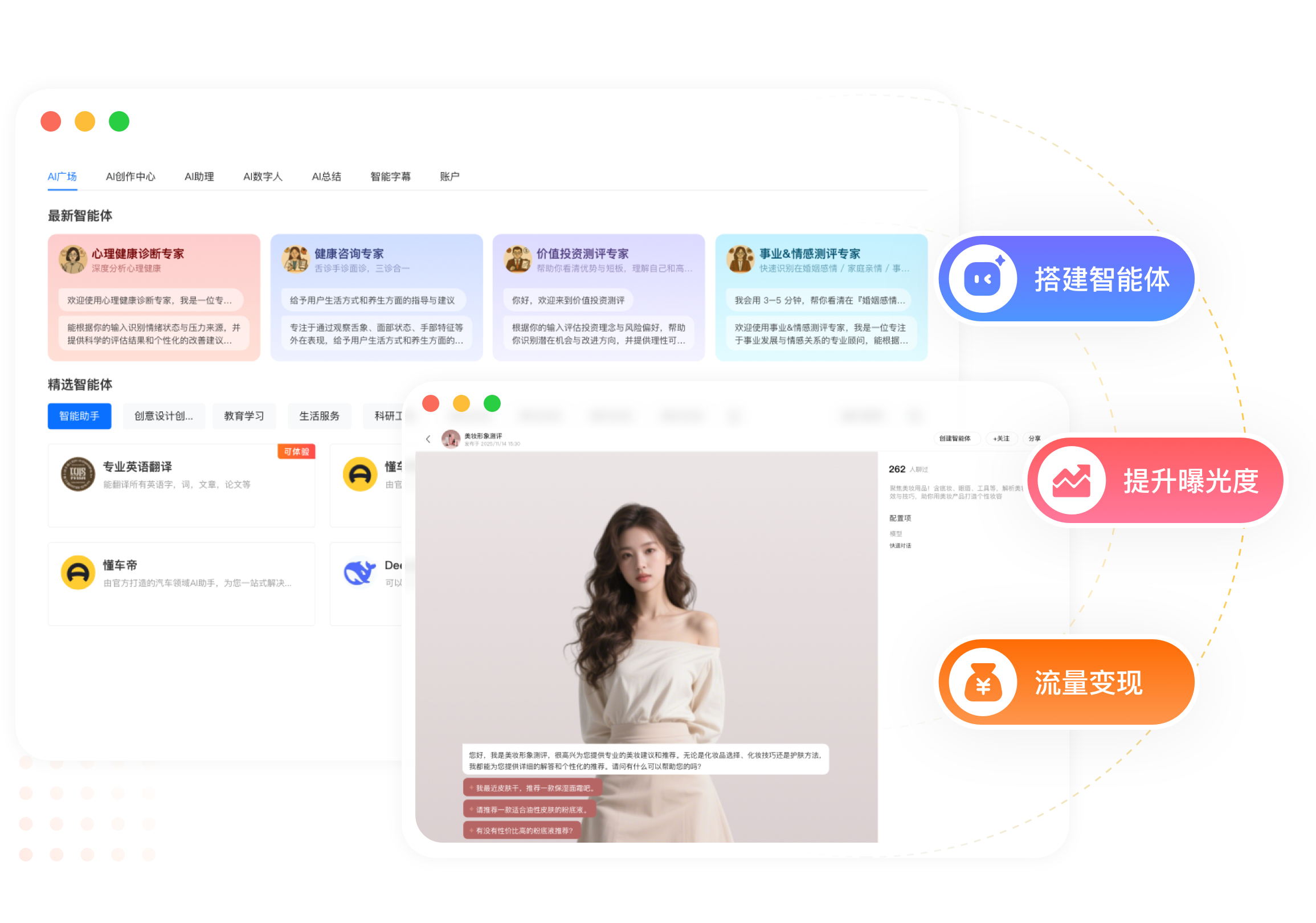 搭建智能体共享服务生态,整合多场景流量入口有效提升智能体曝光度,助力开发者实现流量变现