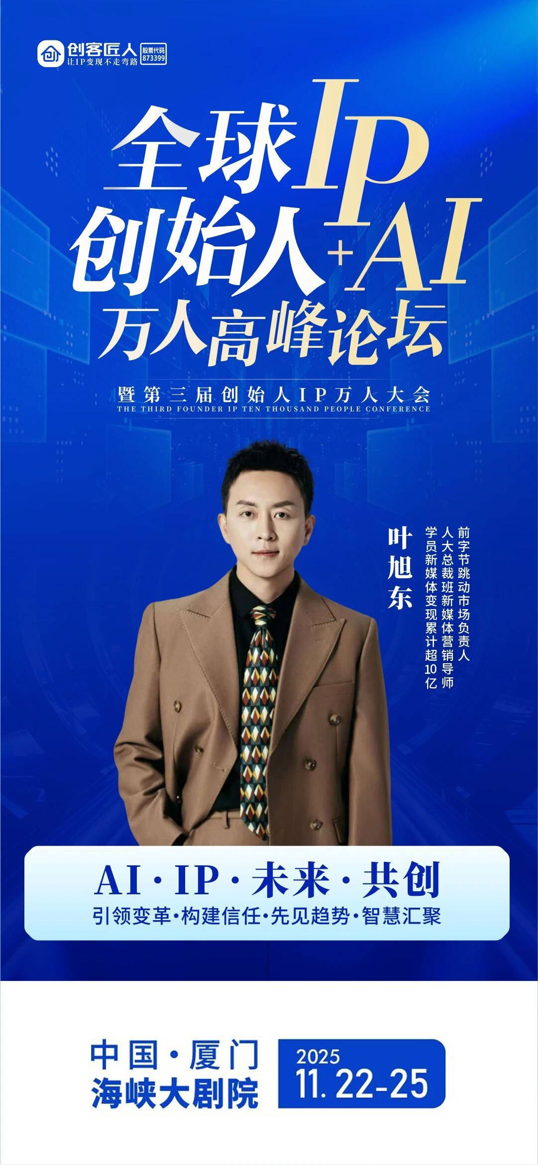 "未来的竞争,是智能IP系统间的较量。AI驱动效率,IP构筑信任,新媒体放大价值。叶旭东——字节前市场负责人、10亿+变现导师,将携实战方法论亮相2025全球峰会,揭秘AI×IP如何重构商业底层逻辑。"