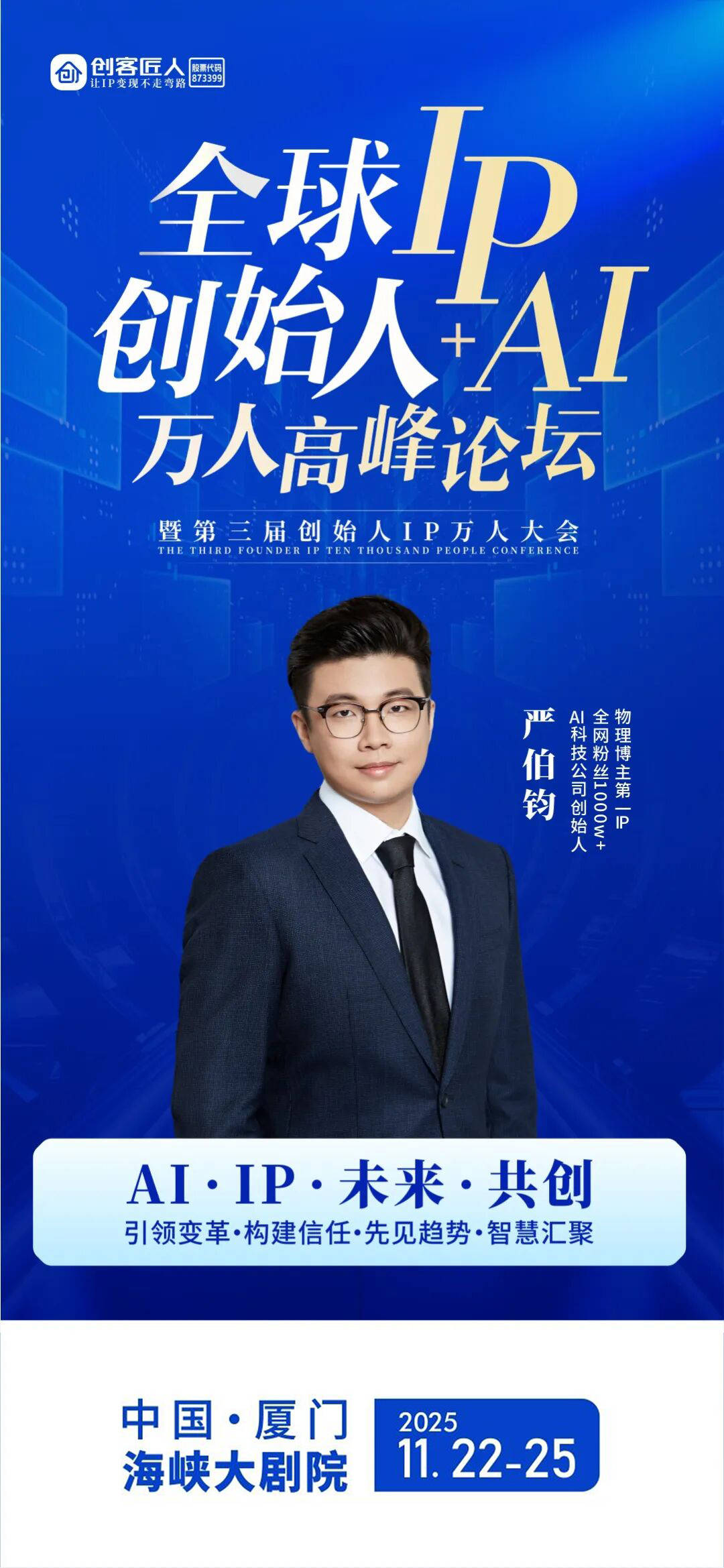 未来的竞争,不是知识的竞争,而是智能驱动的认知竞争。严伯钧老师从物理天才到AI科技创业者,用IP和AI重塑知识商业,让科学破圈、智能落地,11月厦门万人高峰论坛,邀你共赴这场思想盛宴。